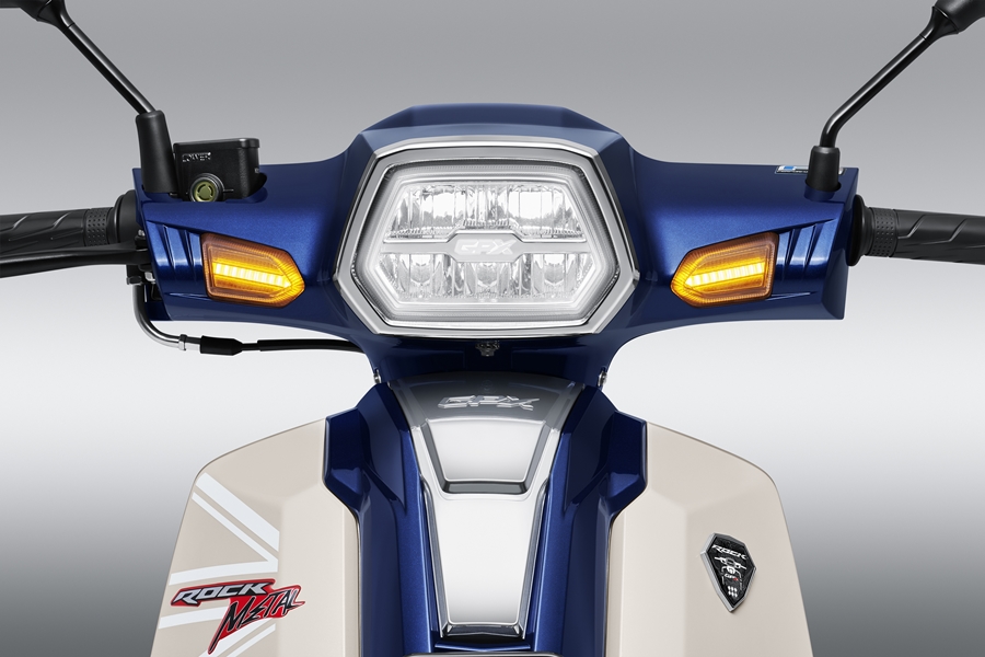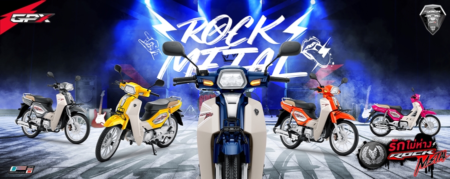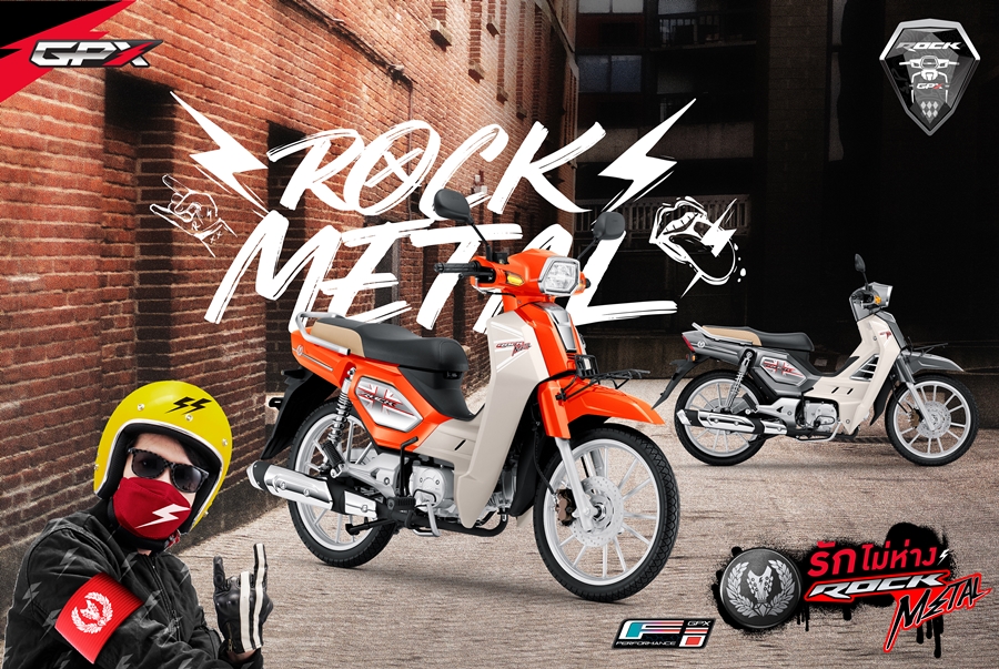 DEEP BLUE WINCHESTER WHITE (น้ำเงิน-ขาว), SATIN SILVER WINCHESTER WHITE (เทา-ขาว) , ORANGE WINCHESTER WHITE (ส้ม-ขาว) , CHOCKING PINK WINCHESTER WHITE (ชมพู-ขาว) และ LUMINOUS YELLOW WINCHESTER WHITE (เหลือง-ขาว) New GPX ROCK METAL มาพร้อมกับเครื่องยนต์พิกัด 110 ซีซี 4 จังหวะ เทคโนโลยีหัวฉีด GPX-Fi (จากแบรนด์ Delphi อเมริกา) เป็นมิตรกับสิ่งแวดล้อมด้วยมาตรฐานไอเสีย EURO 4