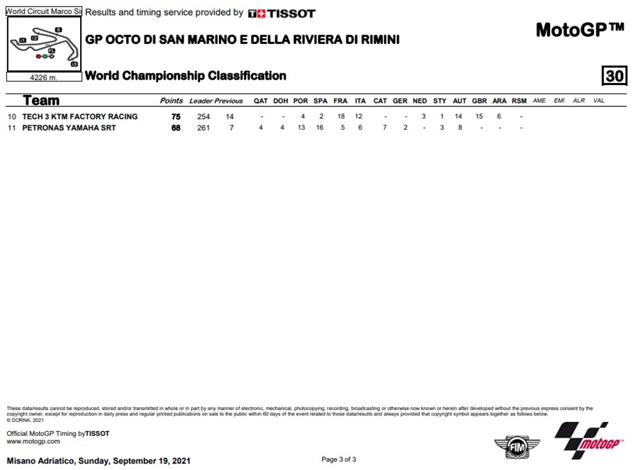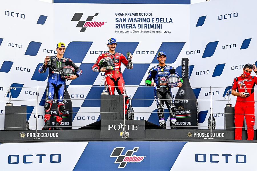 การแข่งขันในสนามนี้ที่ 14 แล้วของฤดูกาล 2021 ในรายการ Gran Premio Octo di San Marino e della Riviera di Rimini ที่สนาม Misano World Circuit Marco Simoncelli ในอิตาลี โดยในสนามนี้เป็น Francesco Bagnaia จาก Ducati Lenovo Team ยังคงโชว์ฟอร์มดุดันพา Ducati Lenovo Team คว้าแชมป์ 2 สนามติด ส่วน Fabio Quartararo จาก Monstar Energy Yamaha MotoGP ได้ที่ 2 ขณะที่ Enea Bastianini จาก Avintia Esponsorama ได้ขึ้นโพเดียมครั้งแรก