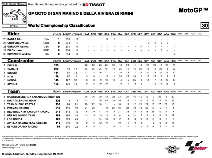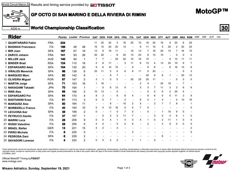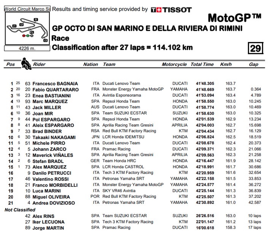 ตอนนี้ Bagnaia เก็บได้ 50 คะแนนจาก 2 เรซ ซึ่งหมายความว่าขณะนี้เขามี 186 คะแนน ห่างจาก Quartararo อยู่ 48 คะแนน ในขณะที่ Joan Mir จาก Team SUZUKI ECSTAR นั้นมีคะแนนสะสมเป็นอันดับ 3 ที่ 167 คะแนน ส่วน Marc Maequez จบการแข่งขันในอันดับที่ 4 และ Maverick Vinales จาก Aprilia Racing Team Gresini จบการแข่งขันในตำแหน่งที่ 13 ด้าน Morbidelli จบการแข่งขันในตำแหน่งที่ 18 และ Dovizioso จบการแข่งขันในตำแหน่งที่ 21 สำหรับการแข่งขันสนามต่อไปจะเกิดขึ้นมี่สหรัฐอเมริกา ที่สนาม Circuit Of The Americas ในรายการ Red Bull Grand Prix of the Americas
