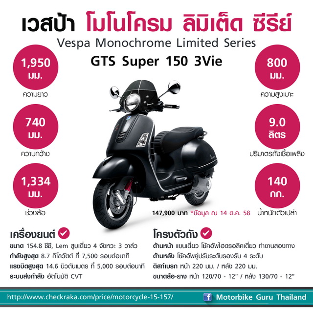 เวสป้า GTS Super 150 3Vie นับว่ามีกำลังเครื่องยนต์เหมาะสมและเพียงพอต่อการใช้งานในเมืองทั่วไปและพื้นที่รอบนอก หรือเดินทางระยะทางที่ไม่ไกลมาก ตัวรถเด่นที่การควบคุมบังคับง่าย สมดุลน้ำหนักดี เมื่อเป็นเวอร์ชั่น Super ช่วยให้ดูสปอร์ตขึ้น พอเป็นรุ่นพิเศษอย่าง โมโนโครม ลิมิเต็ด ซีรีย์ ยิ่งโดดเด่นขึ้นไปอีก ถ้ากำลังเลือกเวสป้าแล้วคิดว่ารุ่น พรีม่าเวร่า (115,900 บาท) และสปรินต์ (119,900 บาท) ดูเล็กไปสำหรับคุณ GTS 150 Super(139,900 บาท) น่าเป็นคำตอบเหมาะสมที่สุด แต่ถ้าต้องการหล่อแบบไม่ซ้ำ (266 คัน) ก็จ่ายเพิ่มแค่ 8,000 บาท เพื่อแลกกับความเท่ของ โมโนโครม ลิมิเต็ด ซีรีย์ ในราคา 147,900 บาท