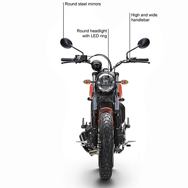 Ducati Scrambler Sixty2 โดดเด่นด้วยสีส้มสวยสด ไฟหน้าทรงกลมมีวงแหวน LED ส่องเวลากลางวัน มาพร้อมตัวถังแบบคลาสสิก เปลือยส่วนเครื่องยนต์ให้เห็นระบบ L-twin อันเป็นเอกลักษณ์ของดูคาติ ไฟท้าย LED