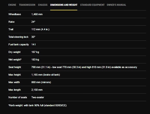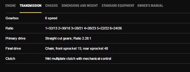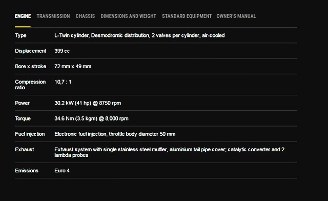 เครื่องยนต์แบบ L-Twin 2 สูบ 4 จังหวะ ขนาดความจุ 399 ซีซี 41 แรงม้า หัวฉีดอิเล็กทรอนิกส์ คันเร่งไฟฟ้า ระบายความร้อนอากาศ เกียร์ 6 จังหวะ คลัตช์มือแบบสาย ส่งกำลังด้วยโซ่ สตาร์ตไฟฟ้า ความสูงเบาะ 790 มม. น้ำหนักรวมของเหลว 183 กก. ความจุถังน้ำมัน 14 ลิตร