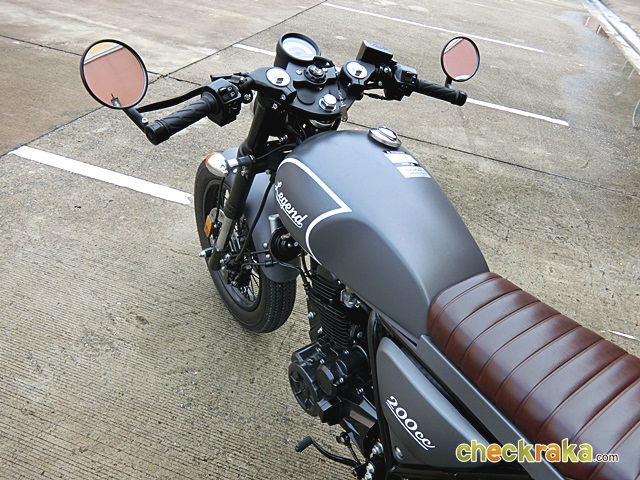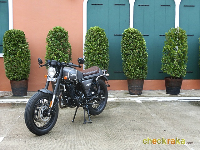 GPX Racing Legend 200 รูปทรงคลาสสิกย้อนยุคสไตล์วินเทจ ไฟหน้าทรงกลมขนาดเล็ก กระจกมองข้างปลายแฮนด์ ถังน้ำมันทรงเหลี่ยม เบาะนั่งสีน้ำตาล ไฟท้ายทรงกลมสะดุดตา แบบเดียวกับของแต่งรถคลาสสิกที่หายาก