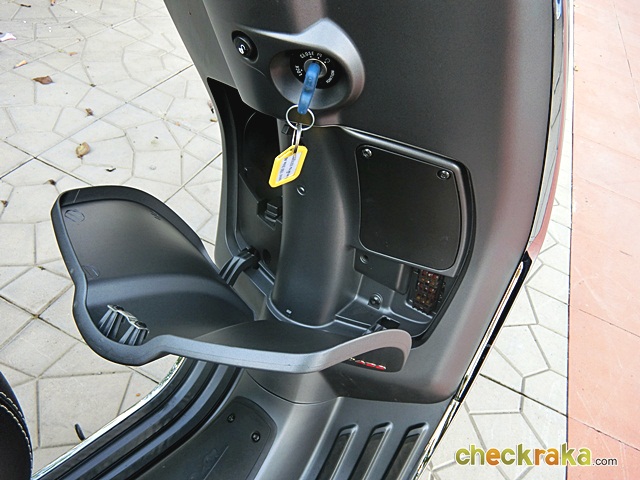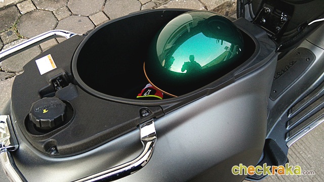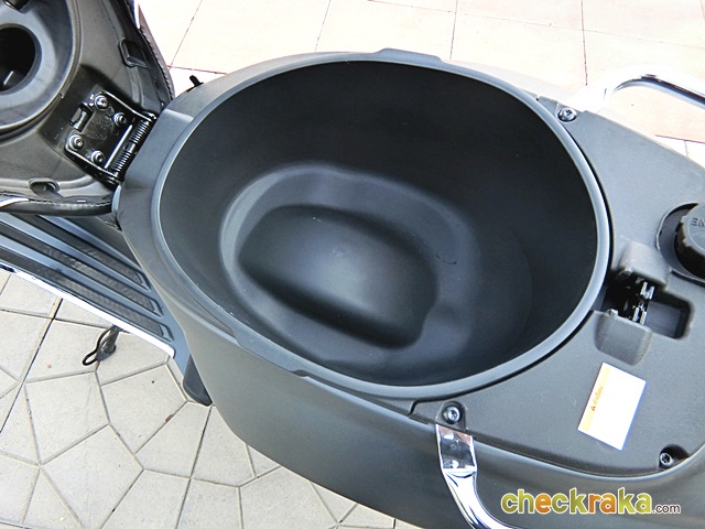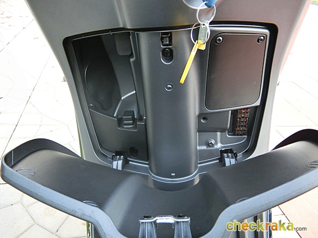 ตรงกลางมีที่เก็บของได้เล็กน้อย หรือพอใส่ขวดน้ำได้ และมีพื้นที่เก็บของใต้เบาะขนาดใหญ่พอตัว ใส่หมวกกันน็อกแบบครึ่งใบได้