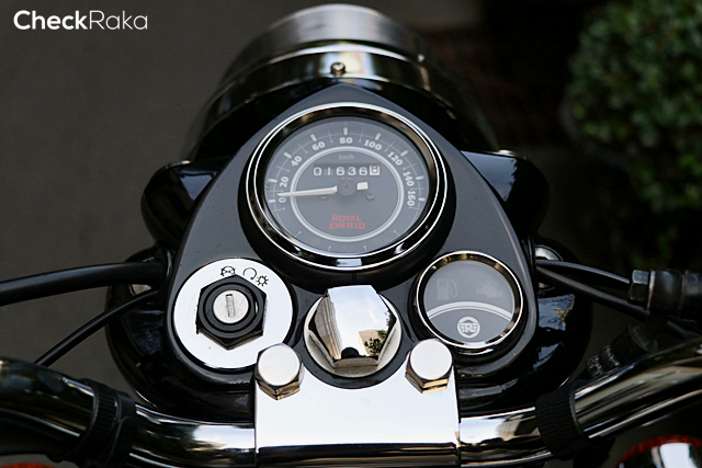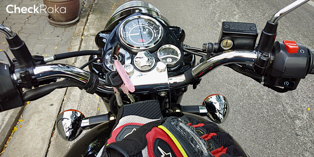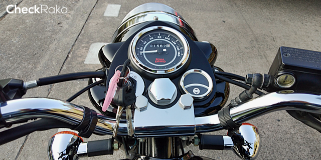 มาตรวัดทรงกลมบอกความเร็ว และเลขกิโลเมตรที่ใช้งาน ส่วนจอล่างฝั่งขวาเป็นไฟเตือนน้ำมันใกล้หมดถังที่ทางบริษัทฯ การันตีว่า "ไฟเตือนขึ้นก็สามารถวิ่งได้อีก 30 กิโลเมตร" และไฟเตือนรูปเครื่องยนต์ แถมด้วยกระจกมองข้างก็ยังมาในสไตล์คลาสสิกเช่นกัน