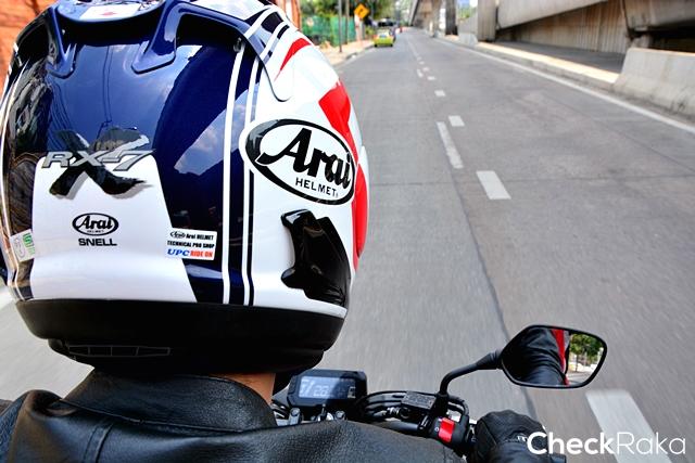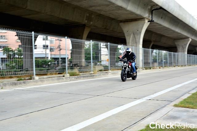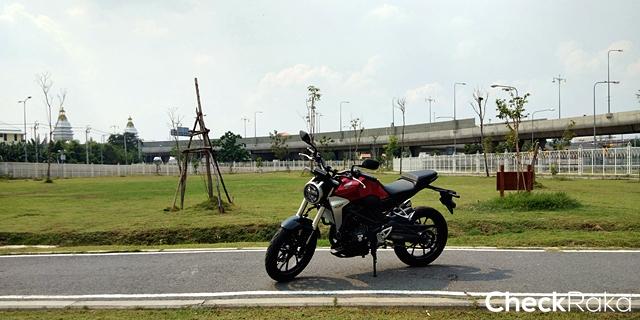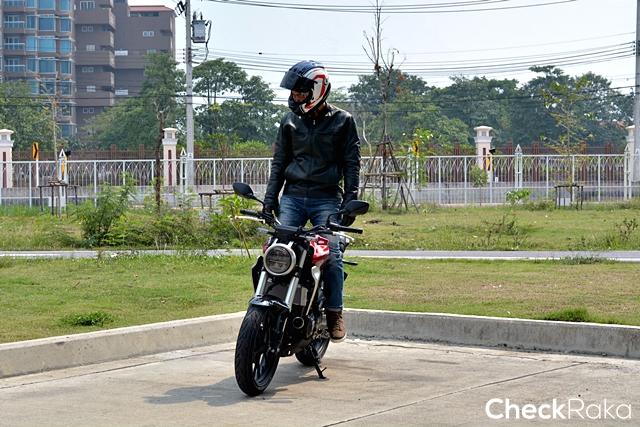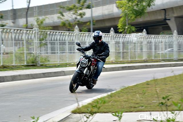 ผมใช้เวลาไม่นานก็พาเจ้า CB300R เลาะเลี้ยวฝ่าความวุ่นวายในเมืองออกมาแถวนนทบุรี ด้วยความคล่องตัวและพละกำลังที่พร้อมให้เรียกใช้ในทุกสถานการณ์ ผมขี่ไปเรื่อยๆ จนภาพถนนข้างหน้าเริ่มโล่งมากขึ้น ตัวเลขความเร็วก็เริ่มขยับขึ้นไปเรื่อย เสียงกำลังเครื่องยนต์ที่ถ่ายทอดผ่านท่อไอเสียเริ่มก้องคำรามดังตอบสนองตามความเร็ว ตัวรถยังนิ่งทะยานไปข้างหน้าอย่างมั่นคง ด้วยยางหน้ากว้างที่ให้มาเต็มที่ทั้งหน้าและหลัง ในช่วงเผลอใจไปกับความเร็ว สัญญานไฟแดงข้างหน้าก็ปลุกโสตประสาทผมให้ตื่น พร้อมกับเบรกเต็มที่เพื่อชะลอหยุดให้ทันแยก ด้วยระบบเบรกอันยอดเยี่ยมที่เป็นเรเดี่ยลเม้าท์และจานเบรกใหญ่ทำงานผสานกับระบบเบรก ABS ทั้งหน้าและหลัง ทำให้ CB300R หยุดสงบนิ่งอย่างที่ใจต้องการได้จริงๆ