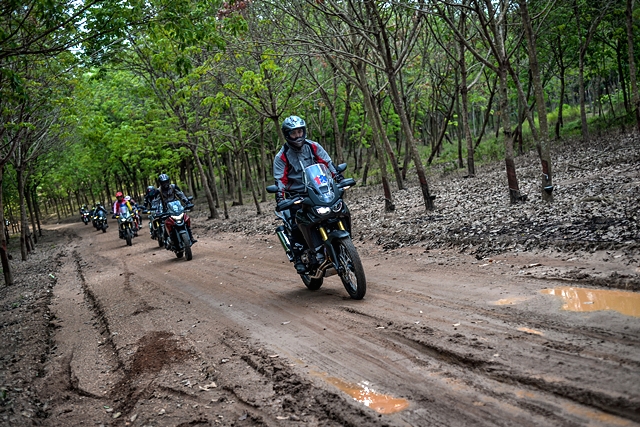 ทริปเริ่มต้นกันที่ ฮอนด้า บิ๊กวิงก์ สาขาถนนประดิษฐมนูธรรม แต่เช้าตรู่ โดยสมาชิกทริปนี้มีทั้ง 5 ผู้โชคดี 3 สื่อมวลชน และทีมงานรวมทั้งหมดเกือบ 20 คัน โดยทั้ง 8 คน ผู้โชคดีกับสื่อฯ รวมผู้เขียนใช้รถ ฮอนด้า แอฟริกา ทวิน (Honda Africa Twin) ในการขี่เดินทาง นอกนั้นมี X-ADV และบิ๊กไบค์ฮอนด้ารุ่นอื่นๆ สมทบ ขบวนฯ ออกเดินทางโดยใช้เส้นทาง รามอินทรา-สุวินทวงศ์ ผ่านเข้าจังหวัดฉะเชิงเทรา จนถึงแยกบ้านโพธิ์ เลี้ยวซ้ายไปตามทางหลวง 3304 เพื่อตัดเข้าทล. 331 และไปแวะพักจุดแรกที่ ไร่เฉลิมสุข ซึ่งอยู่ในพื้นที่ อ.บ่อทอง จ.ชลบุรี การเดินทางในช่วงแรกใช้ความเร็วเดินทางแค่ 100 กม./ชม. เพราะเส้นทางส่วนใหญ่ไม่เอื้อต่อการทำความเร็ว ช่วงสุวินทวงศ์ก็ทำทางอยู่ จากนั้นก็เป็นถนนชนบทเลนสวนและทางดินสลับกัน แต่สำหรับ Honda CRF1000L Africa Twin DCT ที่ผู้เขียนขี่นั้นให้ความสบายกับการเดินทางแบบที่ต้องสลับทางดำกับดินจริงๆ โดยเฉพาะระบบเกียร์ DCT ที่ควบคุมได้ทุกอย่างบนแฮนด์