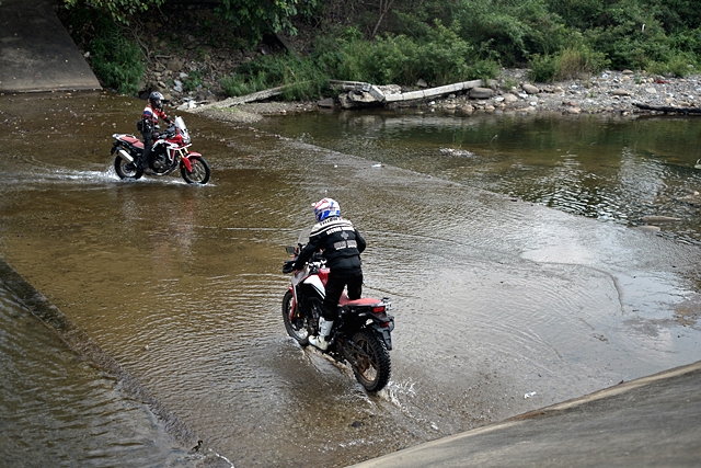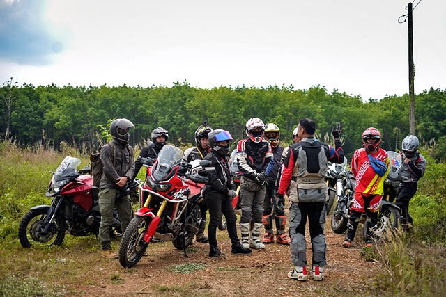 จุดพักแรก ทีมผู้สอนได้อธิบายแนะนำท่าการขี่รถที่ถูกต้องในสถานการณ์ต่างๆ เพื่อปรับพื้นฐานให้เข้าใจร่วมกัน จากนั้นก็เดินทางต่อเพื่อไปพักรับประทานอาหารกลางวันที่ร้านชาวไร่ จังหวัดระยอง เส้นทางส่วนใหญ่ก็ยังเป็นถนนดำ เสร็จจากมื้อกลางวันขบวนฯ เดินทางต่อไปยัง ฝายทดน้ำคลองตาหริ้ว เพื่อพักและเรียนรู้การขี่รถขึ้น-ลงทางลาดชันจากทีมผู้สอน โดยระหว่างทางที่ผ่านมาเป็นทางดินเกือบตลอดและเป็นทางราบ มีบางช่วงที่ต้องขี่ข้ามลำธารเล็กๆ ผ่านพื้นล่างที่เป็นก้อนหินน้อยใหญ่ นับเป็นความท้าทายและสนุกตื่นเต้นของสมาชิกในทริปและทุกคนก็ผ่านไปได้ด้วยดี ส่วนหนึ่งก็เพราะสมรรถนะของเจ้าแอฟริกา ทวิน ที่ลุยได้ดีเยี่ยมกับทางออฟโรดแบบนี้