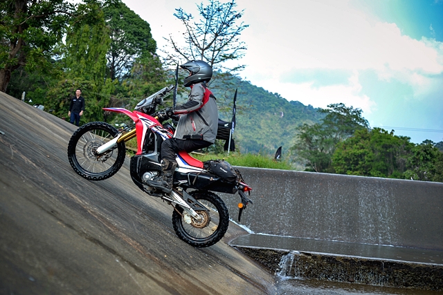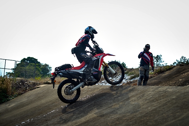 จุดพักที่ 2 หลายคนได้ลองขี่ CRF250 Rally ลงพื้นที่ด้านล่างฝายและไต่กลับขึ้นมา โดยได้เทคนิคและคำแนะนำดีๆ จากทีมผู้สอนทำให้หลายคนกล้าที่จะลองและผ่านไปได้ทุกคน หลังจากนั้นก็เดินทางไปยังที่พัก อาคันตุกะ โฮมสเตย์ จังหวัดจันทบุรี เพื่อพักก่อนลุยต่อในวันที่สอง วันรุ่งขึ้นขบวนฯ เช็คเอาท์แล้วออกเดินทางต่อไปยังเขื่อนคีรีธาร ซึ่งเส้นทางไปยังสันเขื่อนคือ บททดสอบที่แท้ทรูของทริปนี้ เพราะเป็นทางดิน บางช่วงเป็นเลน แอ่งน้ำ และเป็นทางขึ้นเขาชันยาว มีปูนเทไว้พอรับล้อรถยนต์ได้ใช้ไต่ขึ้นไป นอกจากนี้ก็สลับกับทางลง ทางขึ้นที่มีกรวดลอย ทำให้ต้องยืนขี่กันยาวกว่าจะทะลุข้ามเขาออกมายังสันเขื่อนได้ก็กินเวลาพอสมควร เส้นทางเช้านี้เล่นงานหลายคนจนอ่วมล้มบ้าง เข็นบ้าง แต่ก็สะท้อนให้เห็นถึงการเป็นทีมช่วยเหลือกัน ฝ่าอุปสรรคผ่านไปได้จนจบ จากนั้นเส้นทางก็เริ่มเป็นถนนดำ ขี่กันสบายขึ้นหวดยาวไปพักรับประทานอาหารกลางวันที่ร้าน เดอะเนเชอรัล การ์เด้น จังหวัดจันทบุรี