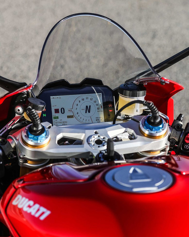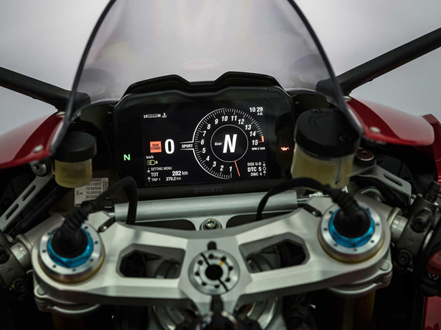 Panigale V4 มีจอแสดงผลสีใหม่ความละเอียดและสว่างสูง TFT แบบสมบูรณ์ขนาด 5 นิ้ว ที่ถูกออกแบบมาใหม่ทั้งหมดทั้งด้านรูปทรงและกราฟิกรวมถึงแป้นวัดรอบทรงกลมแบบเสมือนจริงใหม่ที่อยู่ทางด้านขวามือ