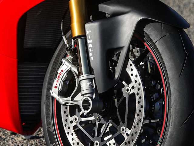 Panigale V4 ใหม่ ใช้ปั๊มเบรก Brembo Stylema แบบชิ้นเดียว วิวัฒนาการล่าสุดของ M50 ที่มีประสิทธิภาพสูงอยู่แล้ว ทำจากโลหะผสมชิ้นเดียวที่มีลักษณะพิเศษคือ พื้นที่ในฟิกซิ่งบุชชิ่งและในตัวปั๊มเบรกที่มีน้ำหนักเบากว่าทำให้ปั๊มเบรกแต่ละข้างเบาขึ้น 70 กรัมโดยไม่สูญเสียความแข็งแกร่ง