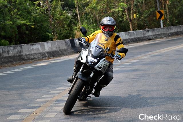 สัมผัสแรกที่ได้ลองนั่งพร้อมทำความคุ้นเคย พบว่าตำแหน่งการวางมือ เท้า ตอบสนองการใช้งานเบื้องต้นได้ดี เบาะอาจสูงไปบ้างสำหรับใครที่สูงไม่เกิน 170 ซม. จริงๆ ผู้เขียนสูง 173 ซม. ตอนขี่ใส่บู๊ทยาวก็กำลังดี ถ้ามองว่ากำลังขี่รถสไตล์แอดเวนเจอร์อยู่ เมื่อลองขี่บนถนนในตัวเมืองไปสักพักก็พบว่า หน้าจอใหม่ให้การมองเห็นที่ง่ายขึ้น รอบเครื่องยนต์ตอบสนองดีมีแรงให้ใช้พอตั้งแต่รอบต่ำ เมื่อเริ่มทำความเร็วได้มากขึ้นลมปะทะก็ถูกบดบังด้วยชิลด์หน้าใหม่ได้อย่างน่าประทับใจ ตำแหน่งปุ่มต่างๆ บนแฮนด์บาร์ไม่ได้มีอะไรเปลี่ยนแปลงไปมากก็ยังคงใช้งานได้ถนัดมือ ด้านระยะห่างตำแหน่งแป้นเกียร์กับ foot pegs ก็มากพอให้งัดด้วยบู๊ทยาวได้สะดวก พอขี่ไปถึงอำเภอสามโคกเลาะเลี้ยวจากถนนดำสู่ช่วงออฟโรด พบว่าตัวรถที่ผ่านวิ่งบนพื้นดินแข็ง เนินหลุมต่างๆ สามารถเก็บแรงกระแทกได้ดีอย่างน่าพอใจ แม้ตัวล้อเป็นแม็กนีเซียมก็ตาม แต่ช่วงด้านหน้าที่ใช้โช๊คอัพขนาด 41 มม. ระยะยุบ 5.3 นิ้ว ผสานการทำงานกับด้านหลังที่เป็นโช๊คอัพเดี่ยวพร้อมปรับพรีโหลดได้ 9 ระดับ ทำให้การขี่บนเส้นทางขรุขระสบายขึ้น