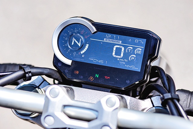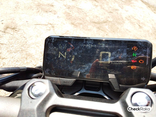 CB650R โดยระดับน้ำมันในถังลดลงช้ากว่า เนื่องจากความจุถังน้ำมัน 16.2 ลิตร จึงทำให้รู้สึกว่าน้ำมันลดลงช้ากว่า CB650R แต่ความจริงแล้ว CB1000R มีอัตราสิ้นเปลืองบนมาตรวัดต่อลิตรน้อยกว่าตามขนาดเครื่องยนต์นั่นเองครับ