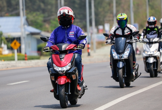ช่วงบ่ายได้เวลาสลับพลัดเปลี่ยนมาลอง Yamaha Lexi 125 เครื่องยนต์ VVA กันบ้าง จากที่เคยสัมผัสในทริปที่เดินทางไป พัทยา มาลองขับกันแบบชิวๆ ถนนโล่งๆ มีโค้งให้สาดกันบ้างเล็กน้อย เพื่อเดินทางต่อไปยังสวนน้ำ ในอำเภอสวนผึ้ง และเหมือนฟ้าฝนอยากให้เราลองสมรรถนะการเกาะถนนของรถสไตล์ครอบครัว สาดสายฝนกันลงมาให้ชุ่มฉ่ำ แต่ทุกคนก็มั่นใจในสมรรถนะ และยางที่ยึดเกาะถนน ทำให้การเข้าโค้งแม้ต้องระมัดระวังมากขึ้นกว่าเดิม ก็ถือว่าเป็นบททดสอบว่าสกู๊ตเตอร์เครื่องยนต์แค่ 125 ก็พาคุณไปถึงจุดหมายได้อย่างปลอดภัย
