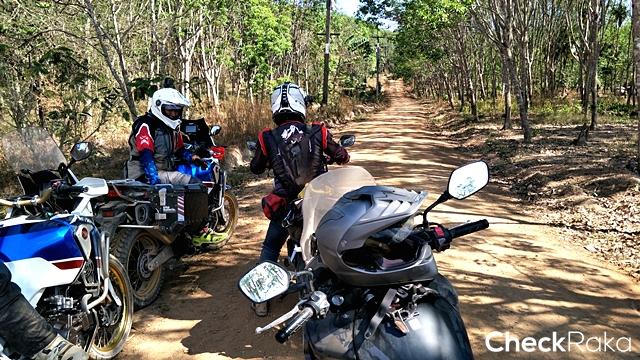 เรามุ่งหน้าไปทางฉะเชิงเทรา มีแวะทานอาหารกลางวันที่ร้านหมูกรอบขึ้นชื่อ แล้วเคลื่อนขบวนฯ มาถึงบ้านโพธิ์ ตัดเข้าสู่ถนนสายรองยังเป็นถนนดำขี่กันยาว จนใกล้เข้าเส้นทางสู่ช่วงออฟโร้ด เราแวะพักคลายร้อนที่ร้านกาแฟกันก่อน ช่วงนี้ผู้เขียนสลับมาขี่ฮอนด้า แอฟริกา ทวิน เกียร์ DCT รุ่นล่าสุด
