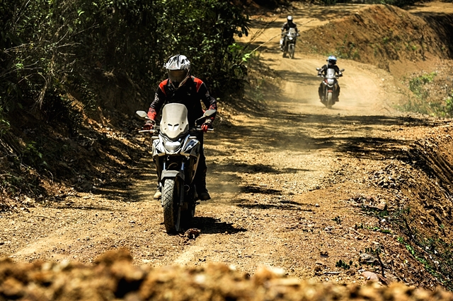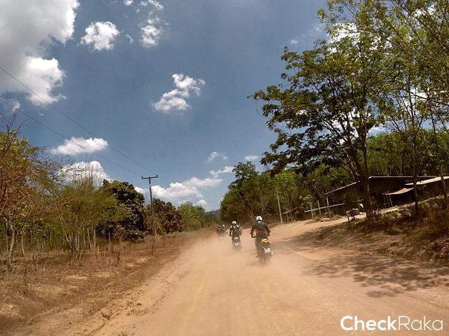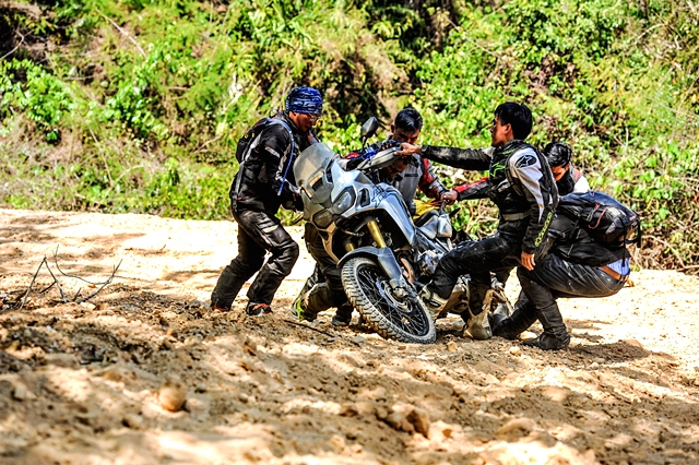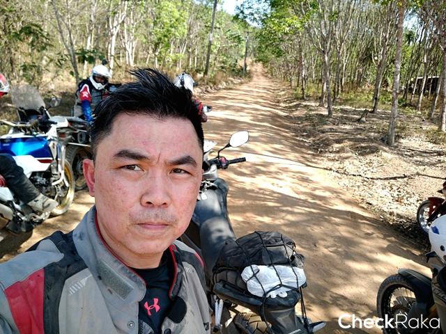 นอกจากนี้ความท้าทายของเส้นทางช่วงที่ต้องขี่บนแนวดินกั้นช้างคือ ไม่มีแนวกั้นใดๆ ถ้าหลุดหรือพลาดไปก็ตกเนินลงข้างทางที่ค่อนข้างสูง และต้องต่อสู้กับอากาศที่ร้อนระอุตลอดช่วงบ่าย ผู้เขียนพบว่าบางช่วงระดับชีพจรเต้นสูงถึง 140 ยิ่งถ้าต้องออกแรงมากเป็นพิเศษ ด่านที่สองเป็นสุดยอดความท้าทายของทริปคือ การไต่เนินชันแล้วต้องหักเลี้ยวขวากลางเนินที่พื้นร่วนซุยสุดๆ ก่อนเข้าไต่โค้งซ้ายขึ้นยอดเนินต่อ จุดนี้ดักไปได้หลายคันที่ต้องยอมสยบให้ ผู้เขียนก็เช่นกันต้องลงแล้วอาศัยเพื่อนร่วมทริปช่วยกันดันรถขึ้น หลังจากนั้นก็ไม่ง่าย เพราะเป็นเนินเล็กขึ้นลง เลี้ยวซ้ายขวาเต็มไปด้วยกรวดลอย อากาศร้อนยังคงเล่นงานเราตลอดทาง เป้น้ำเป็นของจำเป็นสำหรับทริปแบบนี้ แต่การได้น้ำดื่มเย็นๆ จากร้านขายของชำชาวบ้านระหว่างทางนี่เหมือนสวรรค์ชัดๆ ไม่นานเราก็มาถึงด่านสาม ที่แม้เป็นทางขึ้นเนินสูงยาว แต่ท้าทายด้วยความชันแบบต้องแหงนหน้ามอง การทำความเร็วอย่างเหมาะสมก่อนขึ้นเนินเป็นเรื่องจำเป็น และการเลี้ยงรอบใช้เกียร์ให้พอดีจนถึงก็เช่นกัน ถ้าส่งมาเบาไป รถก็อาจหมดแรง ต้องเติมช่วงกลางเนินก็มีสิทธิตะกุยดินฟรีทิ้ง แน่นอนว่าต้องปิดแทร็คชันก่อน ผู้เขียนที่สลับมาขี่