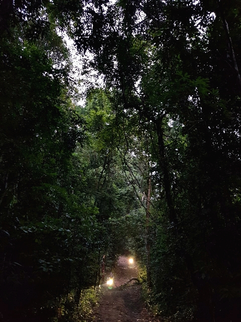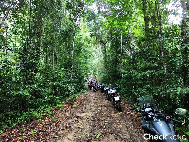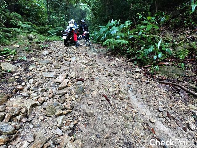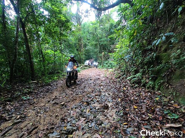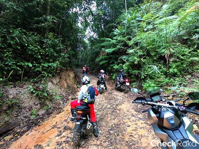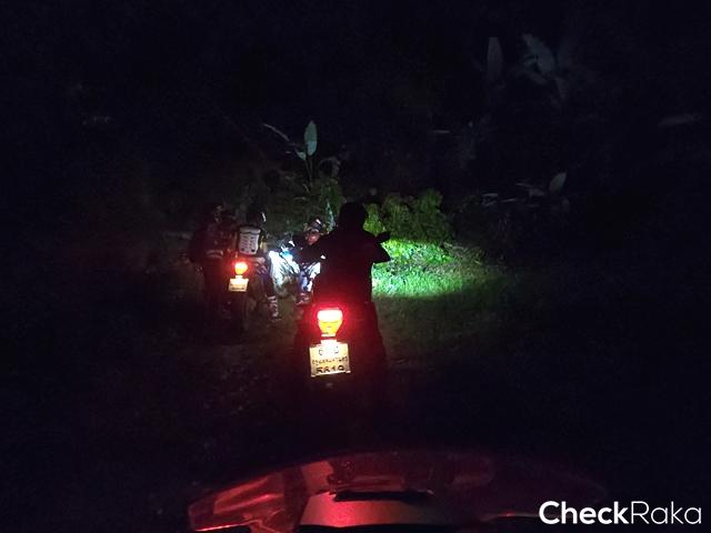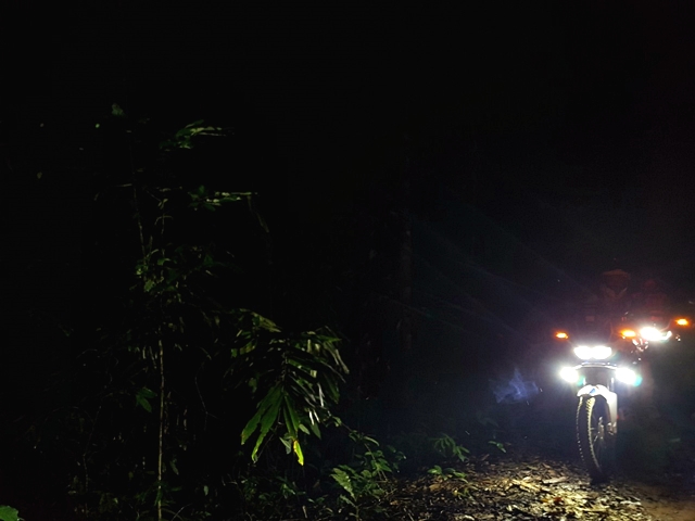 ฮอนด้า X-ADV ที่ต้องลงและเบรกด้วยมือทั้งหน้าและหลังสู้กับแรงโน้มถ่วงของโลก และการกระแทกจากโขดหิน ดินลื่น ร่องน้ำ สารพัด ทำให้ผู้เขียนค่อนข้างตรึงเครียด เวลาผ่านไปเท่าไหร่ไม่รู้ สายตาสอดตามแสงไฟท้ายคันหน้า ความมืดเริ่มสยายปีกปกคลุมทั้งป่า สมองสั่งการว่าควรเผ่นให้เร็วที่สุดและห้ามล้ม!
