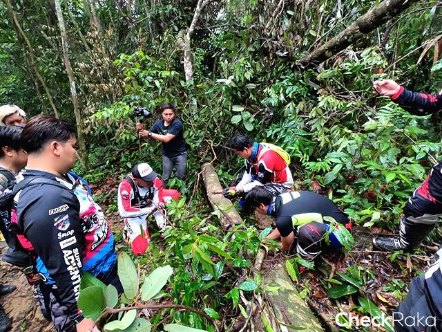 เราก็มาถึงอุปสรรคใหญ่ของทริป ต้นไม้ล้มขวางทางแบบหมดสิทธิ์ไป จะว่าไปเหมือนเจ้าป่าเจ้าเขาไม่อยากให้เราไปต่อ แต่ What Stops You? มาถึงตรงนี้แล้ว ทีมสนับสนุนที่ติดตามมาด้วยพกมีดพร้ามาด้วย ก็ใช้ที่มีนั่นล่ะฟันหมายให้ขาด ซึ่งเป็นไปด้วยความยากลำบาก ต้นไม้ยังสดเกินไป มีดก็เล็กเกินไป แต่ก็ไม่มีทางเลือก ช่วยกันฟันอยู่นานทั้งหาหินมาลอง ขย่มช่วย เราถูกท้าทายเพิ่มขึ้นด้วยสายฝนที่กระหน่ำลงมา เป็นช่วงเวลาสำคัญของทริปจริงๆ แต่ไม่นานฝนก็หยุด เรายังคงฟันต้นไม้กันต่อสลับกันไปตามความอ่อนล้า สุดท้ายต้นไม้ก็ขาด ท่ามกลางความดีใจแต่เราก็ไม่สามารถดึงท่อนไม้หลีกออกจากทางได้ ! เพราะรากที่ยังยึดติดอีกฝั่ง เช่นเดียวกับช่วงบนที่ติดอยู่กับฝั่งป่าอีกด้าน สุดท้ายยังพอหาทางออกกันได้ ด้วยการช่วยกันดันถ่างให้มีช่องพอขี่ผ่านกันได้ แต่