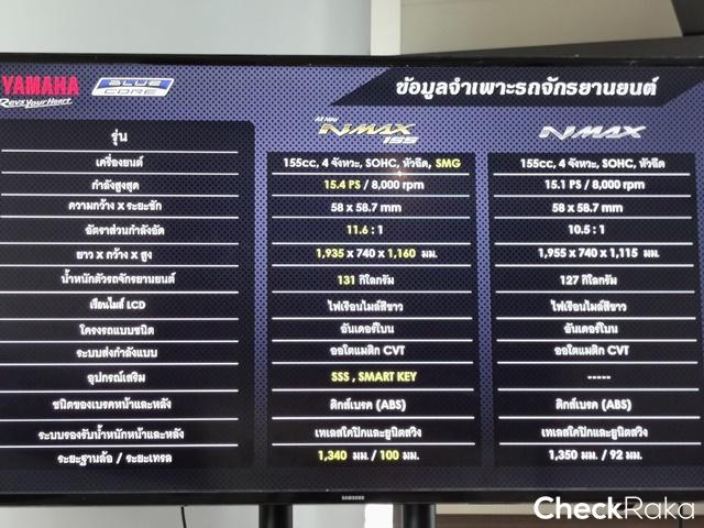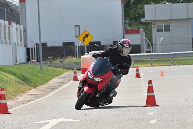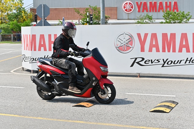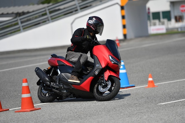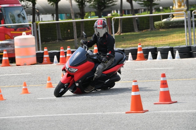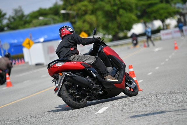 All New YAMAHA NMAX 155 ได้ปรับเปลี่ยนในหลายรายละเอียดแม้รูปทรงรวมๆ ดูคล้ายเดิม โครงรถแบบอันเดอร์โบนก็ออกแบบใหม่ หม้อกรองอากาศก็เช่นกันได้เพิ่มปริมาตรความจุมากขึ้น ถังน้ำมันก็ด้วย ระบบช่วงล่าง ตำแหน่งจุดยึดแท่นเครื่อง ฯลฯ ทั้งหมดทำให้สมรรถนะของ NMAX ใหม่โดยรวมเปลี่ยนไป ซึ่งจากการทดสอบระยะสั้นในสนามของ Yamaha Riding Academy ซึ่งวางรูปแบบเส้นทางให้คลอบคลุมการขี่ในหลายด้านทั้งทางตรง จุดเบรก ทางสะดุด โค้งแคบซ้าย-ขวา พบว่าท่านั่งตำแหน่งการวางมือและเท้าแทบไม่เปลี่ยนไปจากเดิมมากนักหรือมีผลจนรู้สึกได้ แม้ตัวรถสั้นลง และมุมแคสเตอร์หน้าเปลี่ยนองศานิด เมื่อเริ่มขี่ออกไปช่วงแรกที่ทำความคุ้นเคยกับรถและเส้นทาง หน้าจอใหม่ดูใหญ่แต่ส่วนแสดงผลจริงๆ ไม่เต็มจอทำให้รายละเอียดบางส่วนต้องเพ่งแม้จอดเดินเบาก็ตาม อาจเป็นเพราะสายตาผมที่มองใกล้ไม่ดีเท่าไหร่ การควบคุมคันเร่งทำได้ง่าย การออกตัวและเติมความเร็วน่าพอใจไม่ได้หวือหวา แต่ก็ไม่อืดอาด ให้น้ำหนักง่าย ส่วนหนึ่งเพราะน้ำหนักตัวรถที่เพิ่มขึ้นมา 4 กก. ขณะที่แรงม้าเพิ่มมา 0.3 PS ทำให้แรงม้าต่อน้ำหนักอาจด้อยลงไปบ้างก็แลกกับการได้เทคโนโลยีใหม่ๆ เข้ามา ซึ่งก็ไม่ใช่ความต่างที่มีนับสำคัญอะไรมากนัก เมื่อมองว่านี่คือสกู๊ตเตอร์ออโตเมติกที่ถูกออกแบบให้ตอบโจทย์ใช้งานได้ดีรอบด้านทั้งในเมืองและชานเมือง โดยเฉพาะด้านความคล่องตัวที่มีมากขึ้น ขนาดรถที่กระทัดรัดกว่าเดิม ทำให้รู้สึกดีกับการขี่ในช่วงเข้าโค้งแคบที่ตัวรถให้สมดุลที่ดี ควบคุมง่าย ยางติดรถ IRC บนพื้นผิวทดสอบที่ร้อนแห้งสนิท ให้การยึดเกาะที่น่าพึงพอใจไม่น้อย