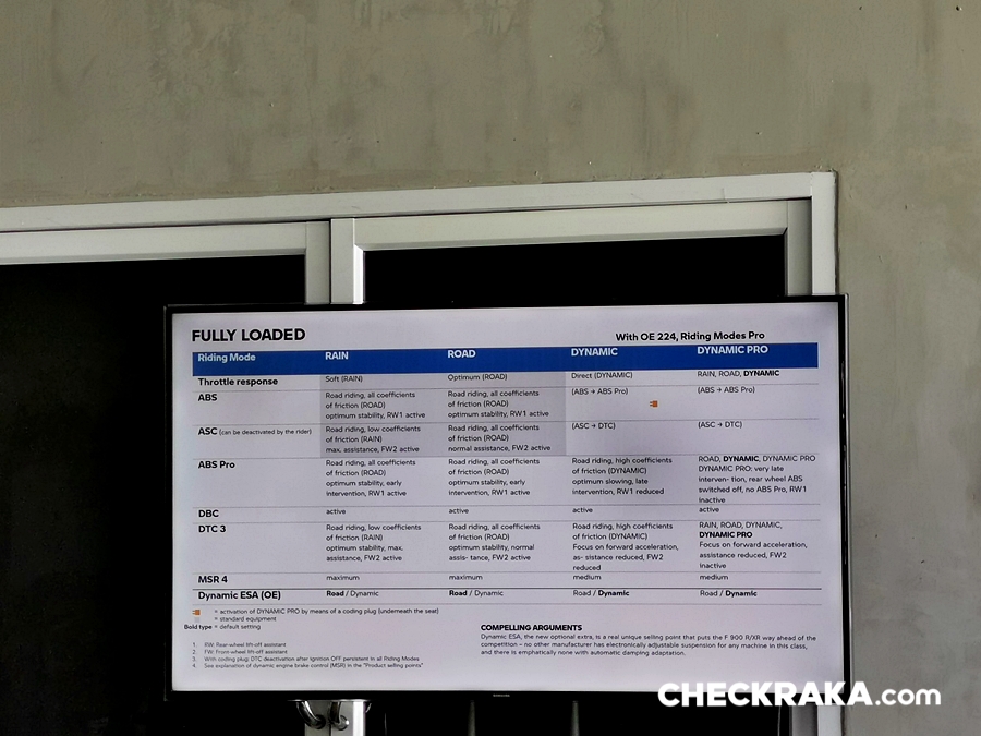 ในการทดสอบในช่วงแรกทีมงานเช็คราคาได้สลับขับขี่ F 900 R ทั้งครบ 3 รุ่นย่อย ซึ่งความจริงเรื่องของสมรรถนะและระบบเทคโนโลยีการขับขี่นั้นแบบเดียวกัน แตกต่างเพียงระบบครุซคอนโทรล และโช๊คอัพไฟฟ้า เป็นต้น