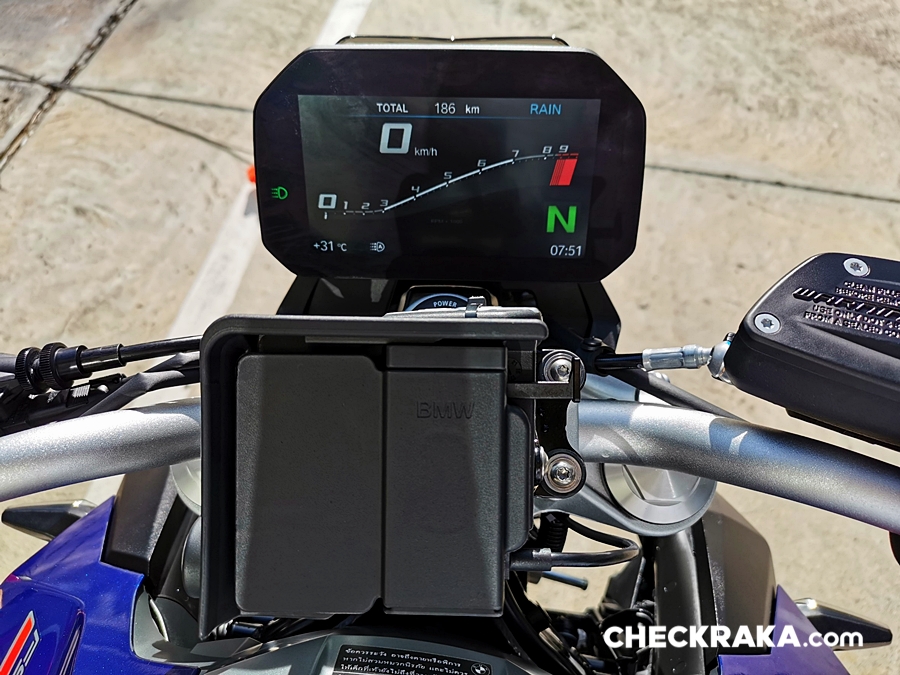 หลังชมโรงงานเสร็จแล้วในช่วงบ่าย ทดลองเชื่อมต่อสมาร์ทโฟนเข้ากับระบบติดต่อสื่อสารของมอเตอร์ไซค์ เพื่อเก็บข้อมูลการขับขี่ผ่านแอปพลิเคชัน BMW MOTORRAD CONNECTED และเปลี่ยนหน้าจอแสดงผล TFT บนตัวรถให้แสดงผลในโหมดสปอร์ต ซึ่งจะแสดงการวัดรอบเครื่องยนต์เหมือนการแสดงผลแบบเข็มวัด พร้อมฟังก์ชันแสดงผลองศาการเอียงของรถ การทำงานของระบบ Dynamic Traction Control (DTC) ระดับการใช้เบรกในระหว่างการขับขี่