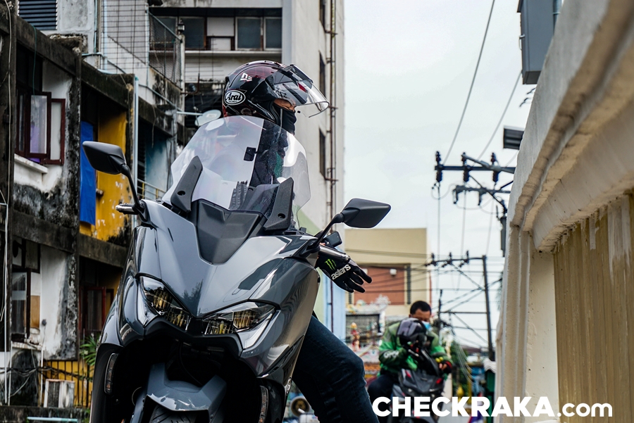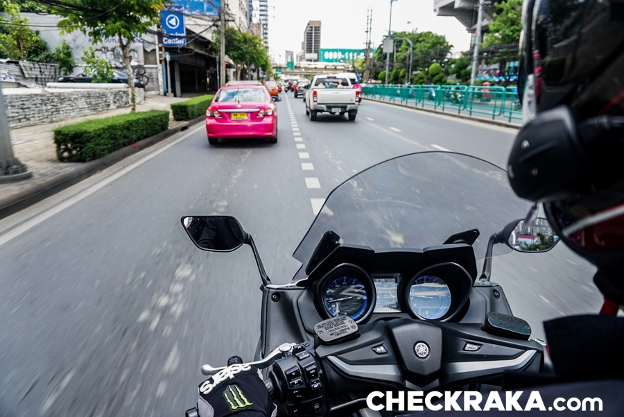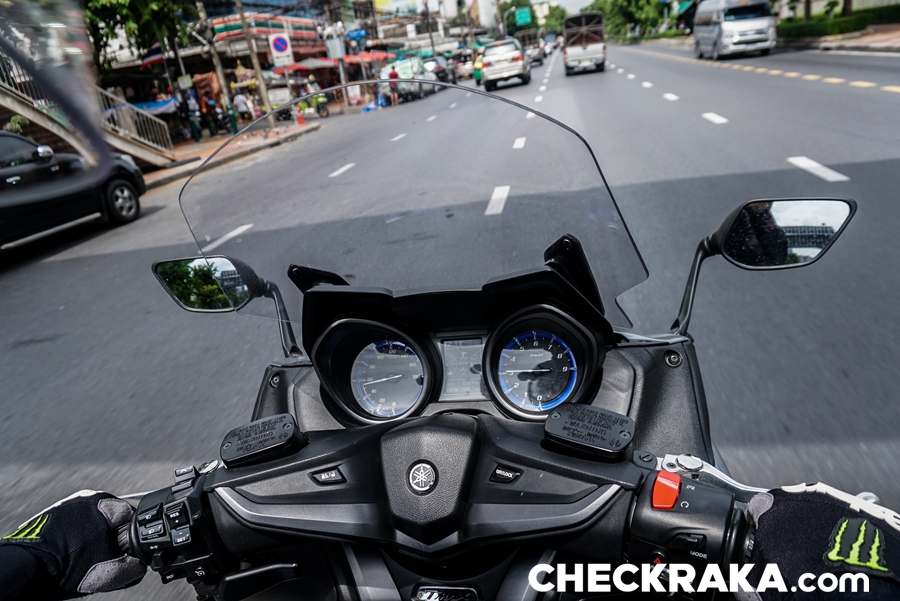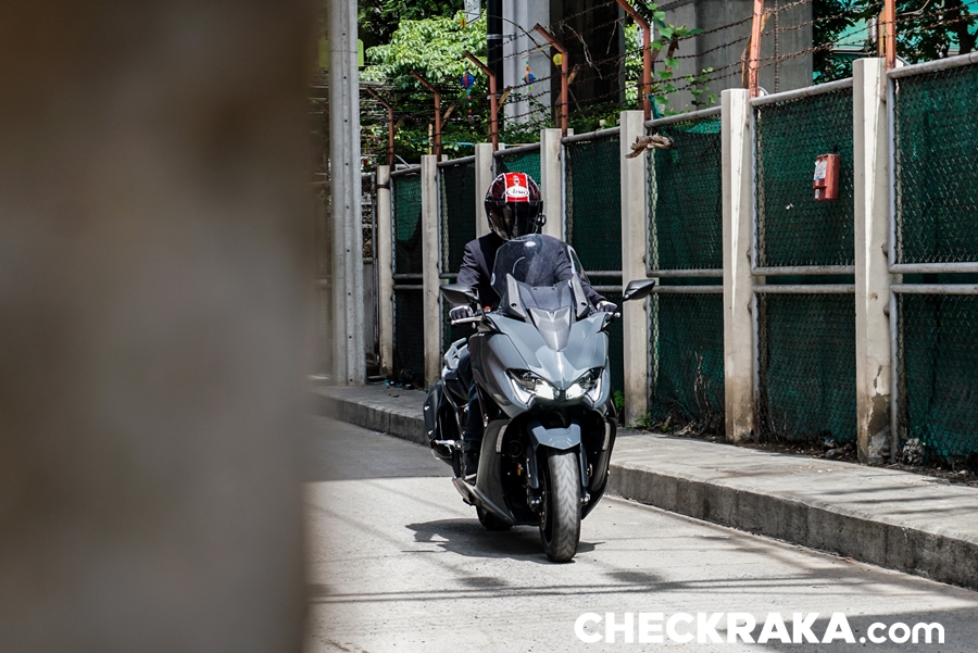การขี่ทดสอบเป็นการใช้งานในเมืองแบบร้อยเปอร์เซนต์ เสมือนการใช้งานในชีวิตประจำวัน เริ่มจากวันแรกรับรถจาก ยามาฮ่า ไรเดอร์ส คลับ ก่อนไปก็ได้รับการอธิบายการใช้งานเป็นอย่างดีจากทีมขาย ผู้เขียนใช้เวลาไม่นานก็คุ้นเคยกับตัวรถ ส่วนตัวก็ขี่สกู๊ตเตอร์ยามาฮ่าอยู่แล้ว สัมผัสแรกที่ประทับใจคือ แรงบิด และเสียงการทำงานของเครื่องยนต์ ส่วนนี้่คือความแตกต่างจากสกู๊ตเตอร์ขนาด 300 ซีซี ที่คุ้นเคยอย่างสิ้นเชิง เสียงการทำงานของเครื่องยนต์ขนาด 560 ซีซี 2 สูบ ผ่านระบบท่อไอเสียเดิมทำไมเร้าใจได้ขนาดนี้ แม้ขี่ด้วยความเร็วต่ำ ไพเราะไม่หนวกหู พร้อมกระตุ้นให้เร่งความเร็วขึ้นไปอยู่ตลอด นอกจากนี้แรงบิดที่มารอก็รู้ถึงพลังที่พร้อมปลดปล่อย และเมื่อเปิดคันเร่งหวังให้พุ่งทะยานไปข้างหน้าก็แปลกใจการความสมูธแบบค่อยเป็นค่อยไป ทำให้ง่ายต่อการควบคุม การโยกบังคับเลี้ยวผ่านรถยนต์บนถนนระหว่างเลน ทำได้อย่างคล่องตัวเช่นเดียวกับเบรกที่กดพร้อมกันหน้าหลังแล้วรู้สึกได้ถึงพลังหน่วงชะลอ ให้ความละเอียดในการเพิ่มน้ำหนักการบีบก้ามเบรกดีไม่น้อย การเบรกหลังที่ความเร็วต่ำเพื่อแต่งรถขณะผ่านช่องทางแคบ พบว่าตัวรถให้สมดุลที่ดีมาก ง่ายต่อกรทรงตัวหยุดนิ่งได้อย่างประทับใจ ง่ายกว่า XMAX ด้วยซ้ำ ติดแค่กระจกมองข้างซ้าย-ขวาที่กินพื้นที่ความกว้างพอสมควร การขี่เข้าเมืองชั้นในเส้นสีลม และใกล้เคียงกลับให้ความสะดวกสบาย แม้การจอด ขยับรถก็ไม่ได้รู้สึกว่าเป็นภาระเหมือนบิ๊กไบค์ขนาด 200 กก. ขึ้นไป นอกจากนี้พื้นที่้ใต้เบาะก็ให้ความอเนกประสงค์เหนือความคาดหมาย แม้ดูไม่กว้างแต่ได้ความลึกเก็บของได้มากพอสมควร และไม่โดนความร้อนจากเครื่องยนต์เข้ามารบกวนเหมือนสกู๊ตเตอร์ทั่วไป ระบบไฟส่องสว่างเวลาขี่ยามค่ำคืนชัดเจนและนุ่มนวลตา เสียงแตรเป็นจุดที่ชอบเพราะเสียงฟังแล้วพรีเมียมจริงๆ ปกติแตรติดรถสกู๊ตเตอร์ฟังแล้วมักไม่ชอบเพราะทำหน้าที่แค่ดังอย่างเดียว นับเป็นรายละเอียดที่แตกต่างจริงๆ ขี่อยู่ 2 วัน สลับไปใช้โหมดสปอร์ตบ้างแต่ก็ไม่นานเพราะเส้นทางและการขี่ในเมืองไม่เหมาะเท่าไหร่ ไฮไลท์ของการทดสอบขี่มาอยู่ในวันสุดท้ายที่ต้องขี่ตากฝนค่อนข้างหนักและวิ่งไกล ผู้เขียนเลือกที่จะไม่หยุด อาศัยการปรับชิลด์หน้าขึ้นมาช่วยลดการปะทะของเม็ดฝน และเมื่อร่างกายเริ่มหนาวสั่นกับความเย็นก็ได้ลองเปิดฮีทกริ๊ปช่วยลงตัวที่ระดับสองจากสาม ส่วนที่เบาะนั่งก็ปรับไว้ที่สองในสามเช่นกัน นับเป็นฟีเจอร์ที่อยู่เหนือความสนใจในการใช้งาน เพราะคิดว่าเหมาะกับเ