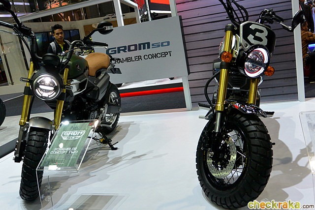 HONDA GROM50 Scrambler Concept One&Two คอนเซปต์ไบค์สไตล์ Neo Retro Scramble จากญี่ปุ่น ตอบสนองกลุ่มวัยรุ่นที่หลงใหลความเป็น Original Style ตัวรถมีโครงสร้างเรียบง่าย แต่ผสานความล้ำสมัยด้วยมิเตอร์ดิจิตอล ไฟหน้า LED ส่วนคอนเซปต์ TWO เป็นแนว Modern Scramble สีสันสไตล์ Military พร้อมลุยทั้งทางเรียบและฝุ่น