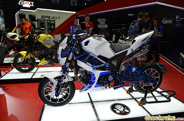 ขนทัพมอเตอร์ไซค์หลากหลายรุ่นมาอวดโฉม พร้อมนิวโมเดลอย่าง "Legend 150" สไตล์แทรคเกอร์ ตามรุ่นพี่ Legend 200 สไตล์คลาสสิกคาเฟ่ โดยเคาะราคารุ่น 200 ที่ 67,500 บาท และ 150 ที่ 55,800 บาท นอกจากนี้ยังมีการเผยโฉมคอนเซปต์ไบค์ "DEMON SCRAMBLER" ที่พัฒนาต่อยอดมาจากรุ่น Demon รุ่นยอดนิยมของ GPX Racing มาร่วมชมมอเตอร์ไซค์สัญชาติไทย พร้อมโปรโมชั่นพิเศษได้ที่บูธ C5 ในมอเตอร์โชว์ 2016