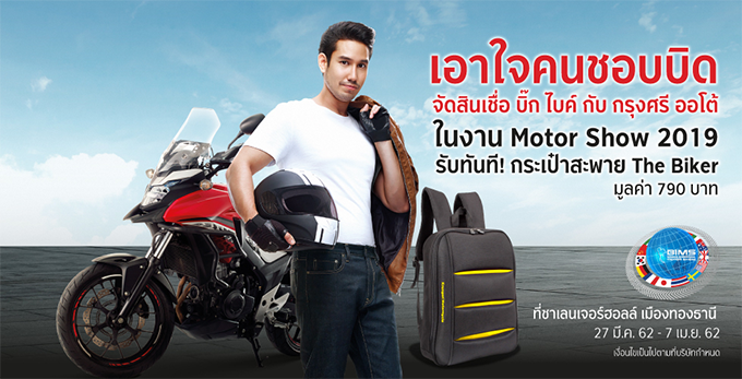 เอาใจคนชอบบิด จัดสินเชื่อ บิ๊ก ไบค์ กับ กรุงศรี ออโต้ ในงาน Motor Show 2019 รับทันที! กระเป๋าสะพาย The Biker มูลค่า 790 บาท พบกันที่งาน The 40th Bangkok International Motor Show วันที่ 27 มีนาคม 2562 - 7 เมษายน 2562 ที่ ชาเลนเจอร์ฮอลล์ 1-3 อิมแพ็ค เมืองทองธานี (ตำแหน่งบูธกรุงศรี ออโต้ อยู่ด้านหน้าทางเข้าชาเลนเจอร์ฮอลล์ 2 บริเวณทางเข้าประตู 3) พิเศษ! แจกบัตรเข้าชมงาน เพียง Add Friend line กรุงศรี ออโต้
