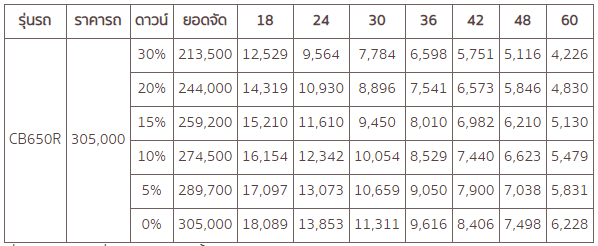 ตารางผ่อนชำระตามอัตราดอกเบี้ยสำหรับ Honda CB650R