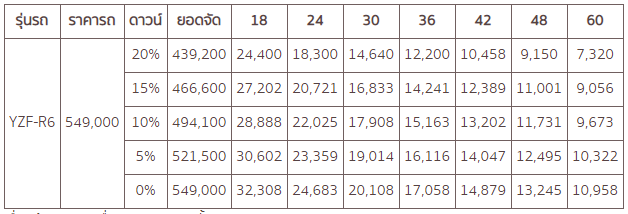 ตารางผ่อนชำระตามอัตราดอกเบี้ยสำหรับ Yamaha YZF-R6