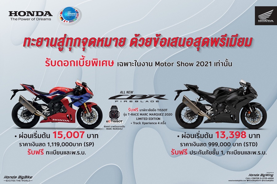 กลุ่มรถสปอร์ต แรงสุดด้วยเทคโนโลยีจากสนามแข่งในรุ่น Honda CBR250RR SP ราคาเงินสด 239,900 บาท หรือเลือกผ่อนเริ่มเพียง 3,352 บาท ดอกเบี้ยพิเศษ 3.95% ต่อปี รับฟรี! ทะเบียน + พ.ร.บ. และประกันภัยชั้น 1 (มูลค่า 10,000 บาท) รวมถึงหมวกกันน็อกเต็มใบจาก H2C มูลค่า 3,460 บาท และสิทธิ์ร่วมกิจกรรม Honda Track Xperience ที่สนามช้างฯ จำนวน 2 ครั้ง มูลค่า 5,000 บาท