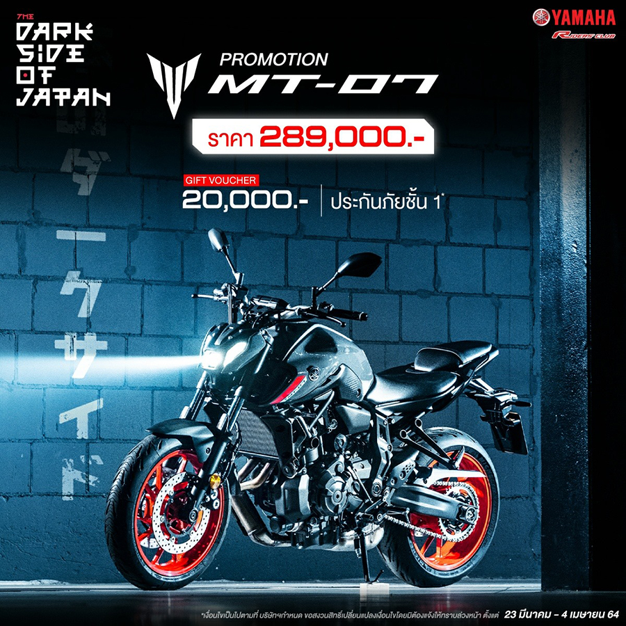 สัมผัส NEW HYPER NAKED กับความดุดันเร้าใจทุกองศา NEW MT-07 เปิดราคากระชากใจที่ 289,000.- พร้อมโปรโมชันสุดเร้า ฟรี! Gift Voucher 20,000.- และประกันภัยชั้น 1 ตั้งแต่วันที่ 23 มี.ค. - 4 เม.ย. 64 เท่านั้น ในงาน Motor Show และ Yamaha Riders’ club ทั่วประเทศ