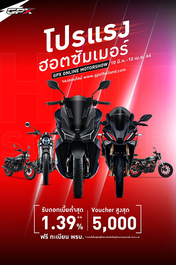 GPX ส่งโปรแรงฮอตซัมเมอร์! ใน GPX Online Motor Show สิทธิพิเศษเฉพาะจองออนไลน์เท่านั้น รับส่วนลดพิเศษสูงสุด 5,000 บาท พร้อมดอกเบี้ยต่ำสุดเพียง 1.39% ตั้งแต่ วันที่ 10 มี.ค. – 10 เม.ย. 64 นี้!