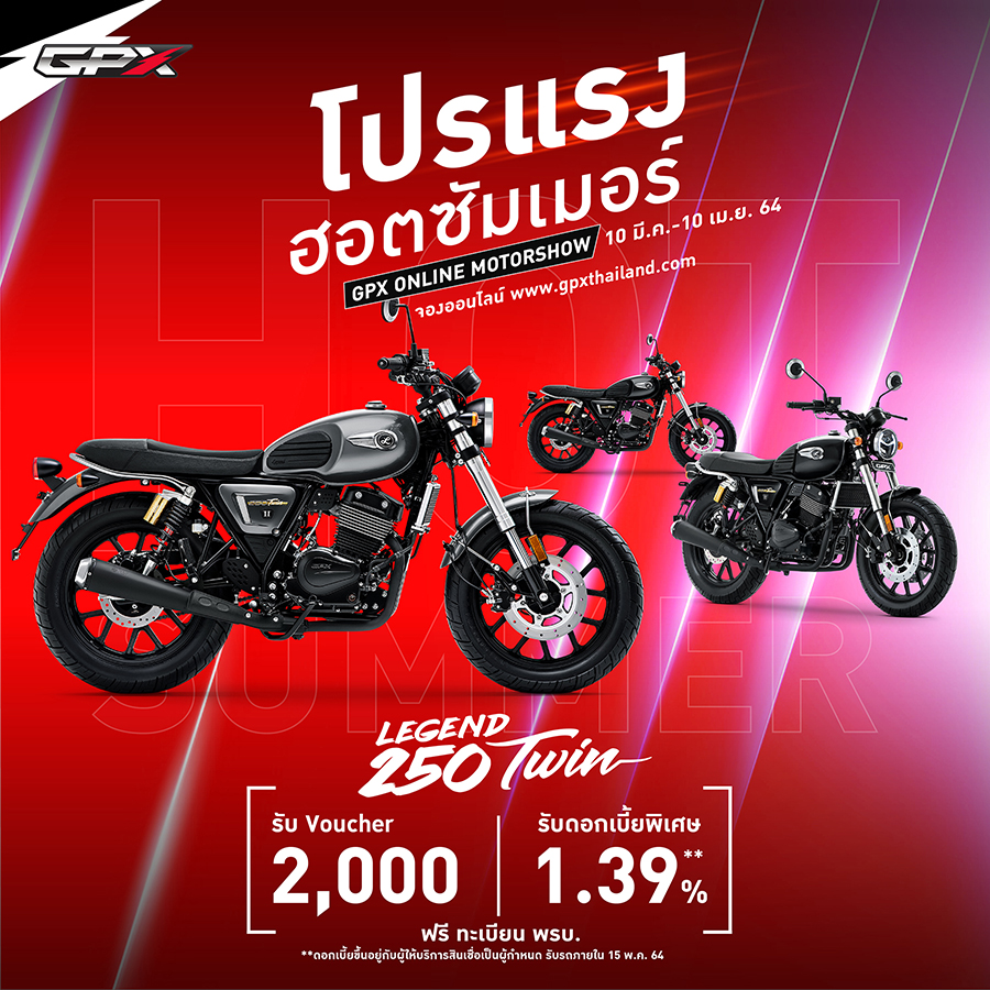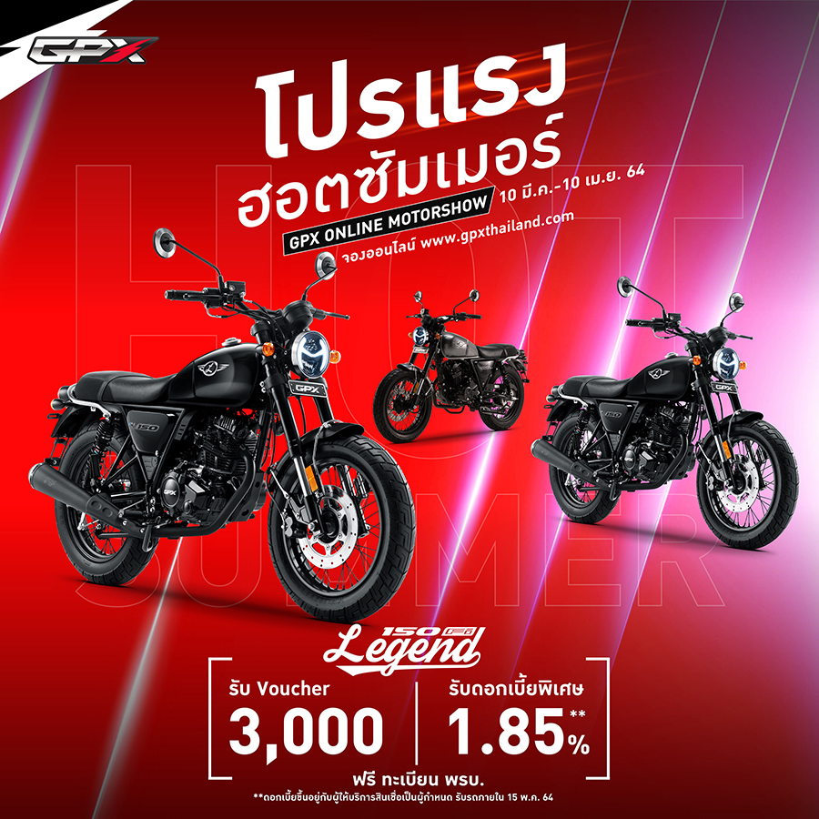 ขนข้อเสนอสุดพิเศษมามอบให้กับเหล่าไบค์เกอร์ ในแคมเปญ GPX Online Motor Show *สิทธิพิเศษเฉพาะจองออนไลน์เท่านั้น* เพียงจองรถรุ่น DRONE , DEMON GR200R , LEGEND250 TWIN, LEGEND250 TWIN II และ LEGEND 150-Fi ผ่านทาง www.gpxthailand.com ตั้งแต่ วันที่ 10 มี.ค. – 10 เม.ย. 64 นี้! รับส่วนลดพิเศษสูงสุด 5,000 บาท , ฟรี ทะเบียน + พรบ. พร้อมรับอัตราดอกเบี้ยต่ำสุดเพียง 1.39% และการรับประกันนานถึง 3 ปี หรือ 30,000 กิโลเมตร
