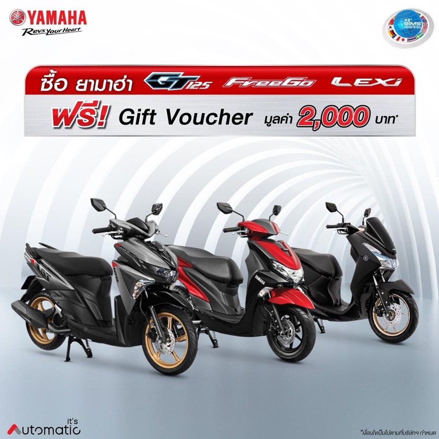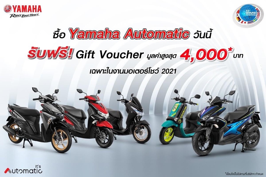 สายออโต้คุ้มมาก! ซื้อยามาฮ่าออโตเมติกรุ่นที่ร่วมรายการ รับฟรี! Gift Voucher มูลค่าสูงสุดถึง 4,000 บาท* โปรโมชันพิเศษ เฉพาะในงานมอเตอร์โชว์ 2021 เท่านั้น