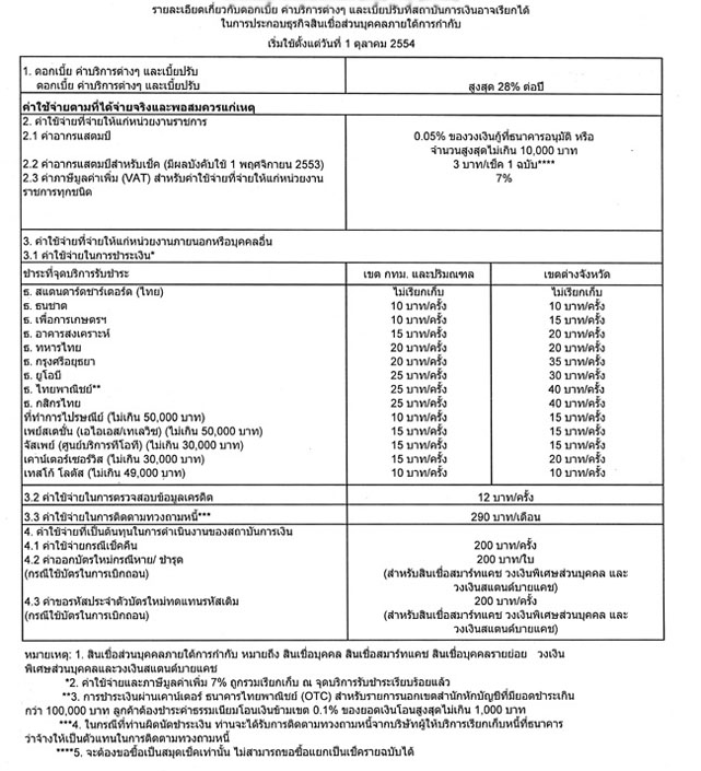 - ในกรณีของธนาคาร (ทั้งสินเชื่อบัตรกดเงินสดและสินเชื่อเงินก้อน): ธนาคารจะเรียกเก็บดอกเบี้ยปกติ ดอกเบี้ยผิดนัด ค่าบริการ หรือเบี้ยปรับในการชำระหนี้ล่าช้า เมื่อคำนวณรวมกันแล้วเกินร้อยละ 28 ต่อปี (Effective Rate) ไม่ได้ (ไม่ว่าจะเรียกเก็บจากลูกค้าอย่างใด เช่น X บาทต่อครั้ง หรือเรียกเก็บในเวลาใด เช่น วันแรกที่ขอสินเชื่อ หรือเมื่อครบกำหนดชำระในแต่ละเดือน เป็นต้น)