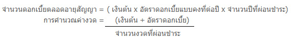 1. อัตราดอกเบี้ยคงที่ตลอดอายุสัญญาเงินกู้ (Flat Rate) โดยดอกเบี้ยจะถูกคิดคำนวณจากจำนวนเงินต้นเริ่มแรกทั้งก้อนแบบเต็มจำนวนตลอดอายุสัญญาเลย (โดยไม่ได้คิดจากดอกเบี้ยจากยอดเงินต้นที่ลดลง) แล้วจะรวมเข้าไปกับเงินต้นแล้วเฉลี่ยเป็นรายงวด งวดละเท่าๆกัน เช่นเดียวกับสินเชื่อเช่าซื้อรถยนต์ ซึ่งวิธีการคิดคำนวณดอกเบี้ยในอัตราคงที่สามารถคิดได้ตามสูตร ดังนี้