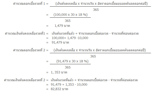 ตัวอย่าง เงินกู้สินเชื่อส่วนบุคคล 100,000 บาท ในอัตราดอกเบี้ย 18 % ต่อปี โดยมีกำหนดระยะเวลาผ่อนชำระงวดละ 10,000 บาท