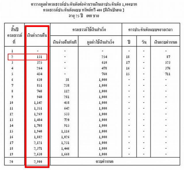 หมายเหตุ : จำนวนมูลค่ากรมธรรม์ประกันภัยในตารางเป็นจำนวนที่ระบุต่อจำนวนเงินเอาประกัน 1,000 บาท