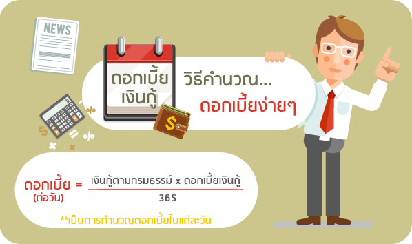 ดอกเบี้ย = 50,000 x 7% / 365 = 9.59 บาทต่อวัน |