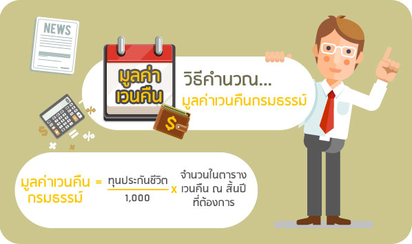 มูลค่าเวนคืนกรมธรรม์จะมีมูลค่า = (1,000,000/1,000) x 131 บาท = 131,000 บาท |