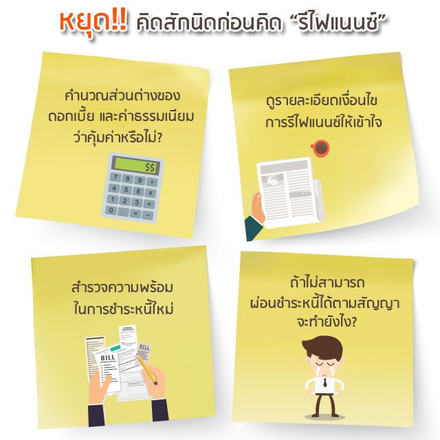 หมายเหตุ : การรีไฟแนนซ์รถยนต์ทำให้เรามีส่วนต่างมาใช้จ่ายก็จริง แต่เราก็จะต้องเป็นหนี้นานขึ้นอีก แถมเป็นหนี้เพิ่มมากขึ้นอีกด้วย ก่อนตัดสินใจรีไฟแนนซ์ลองตรวจสอบความจำเป็นในการใช้เงิน และความสามารถในการใช้หนี้ของเราด้วยนะคะ