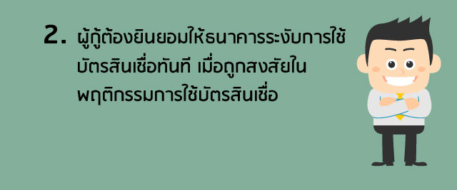 กรณีที่ผู้กู้ใช้บัตรนอกเหนือจากหลักเกณฑ์ เงื่อนไข และวิธีการ ตามที่ธนาคารกำหนด หรือใช้บัตรโดยไม่สุจริต หรือธนาคารมีข้อสงสัยในพฤติกรรมการใช้วงเงินหรือใช้บัตรประกอบรหัสบัตร ผู้กู้ตกลงและยินยอมให้ธนาคารระงับการใช้บัตร และ/หรือตรวจสอบรายการของการใช้บัตรในรายการที่ธนาคารมีข้อสงสัยได้ และ/หรือระงับการเบิกใช้เงินกู้ และผู้กู้ตกลงชำระหนี้ดังกล่าวให้แก่ธนาคารทันทีที่ได้รับการเรียกเก็บ โดยผู้กู้ตกลงจะไม่เรียกร้องค่าเสียหายใดๆ จากธนาคาร