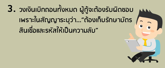 ผู้กู้จะต้องเก็บรักษาบัตรและรหัสบัตรเป็นความลับไม่เปิดเผยให้ผู้อื่นทราบ และห้ามมิให้บุคคลอื่นใช้บัตรหรือรหัสบัตรแทนไม่ว่าด้วยวิธีใดๆ และโดยที่ธนาคารไม่ทราบรหัสบัตรของผู้กู้ และผู้กู้เป็นบุคคลที่รู้รหัสบัตรแต่เพียงผู้เดียว ดังนั้น หากเกิดรายการการใช้บัตรร่วมกับรหัสบัตร ผู้กู้ตกลงและยินยอมที่จะรับผิดชอบชำระเงินทั้งหมดที่มีการเบิกเงินสด หรือนำไปใช้ประกอบการชำระราคาสินค้า/บริการผ่านบัตรไม่ว่าจะกระทำโดยผู้กู้เอง หรือผู้อื่นที่ทราบรหัสบัตรของผู้กู้ โดยผู้กู้ยอมรับว่ารายการใดที่ถูกบันทึกการใช้บัตรของผู้กู้ถือว่าเป็นหลักฐานยืนยันการทำธุรกรรมผ่านบัตรที่ผู้กู้จะต้องเป็นผู้รับผิดชอบ