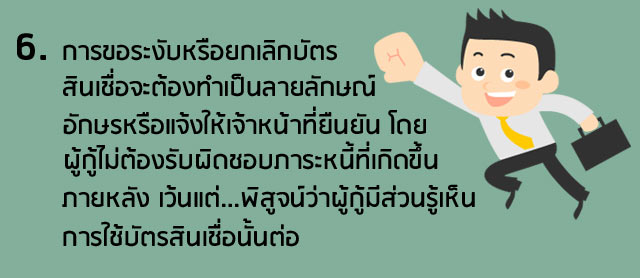 ในกรณีที่บัตรถูกขโมย หรือสูญหายไม่ว่าด้วยเหตุใดก็ตาม และผู้กู้ประสงค์จะขอระงับการใช้บัตรชั่วคราว หรือยกเลิกการใช้บัตร ผู้กู้จะต้องแจ้งให้ธนาคารทราบเป็นลายลักษณ์อักษร หรือแจ้งทางโทรศัพท์กับเจ้าหน้าที่ของธนาคาร และเมื่อธนาคารสามารถยืนยัน หรือตรวจสอบตัวตนผู้ออกคำสั่งระงับ หรือยกเลิกการใช้บัตรดังกล่าวว่าถูกต้องแล้ว ธนาคารจะระงับหรือยกเลิกการใช้บัตรเมื่อครบกำหนด 5 นาที นับตั้งแต่เวลาที่ได้รับแจ้งดังกล่าว หากธนาคารยังมิได้รับแจ้งดังกล่าว และมีผู้นำบัตรและรหัสของผู้กู้ไปใช้เบิกเงินสด หรือนำไปประกอบการเบิกใช้เงินกู้ เพื่อซื้อสินค้า/บริการ หรือกระทำการใดๆ อันเป็นผลต่อวงเงินสินเชื่อที่ได้รับ ผู้กู้จะต้องรับผิดชอบต่อธนาคารในเงินกู้ดังกล่าวรวมทั้งดอกเบี้ย ค่าบริการ ค่าธรรมเนียม และค่าใช้จ่ายที่ธนาคารเรียกเก็บได้ตามสัญญานี้ จนกระทั่งธนาคารได้รับแจ้งว่าผู้กู้ประสงค์ระงับการใช้บัตรชั่วคราวหรือยกเลิกใช้บัตร และธนาคารได้ระงับหรือยกเลิกการใช้บัตรดังกล่าวแล้ว ทั้งนี้ เมื่อธนาคารระงับหรือยกเลิกการใช้บัตรแล้ว ผู้กู้ไม่ต้องรับผิดชอบต่อภาระหนี้ที่เกิดขึ้นภายหลัง เว้นแต่พิสูจน์ได้ว่าผู้กู้เป็นผู้ใช้บัตรหรือผู้กู้มีส่วนร่วมหรือรู้เห็นกับการใช้บัตร
