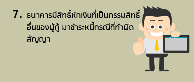 ในกรณีที่ผู้กู้ผิดนัดชำระหนี้ตามสัญญานี้ หรือตกเป็นผู้ผิดนัดผิดสัญญานี้ ธนาคารมีสิทธิที่จะหักเงินหรือนำเงินใดๆ ที่ผู้กู้มีสิทธิเรียกร้องต่อธนาคารหรือที่ผู้กู้เป็นเจ้าของหรือเป็นเจ้าของร่วม หรือเป็นเจ้าหนี้ธนาคาร เพื่อมาชำระหนี้ของผู้กู้ที่มีอยู่กับธนาคารได้ทันที แม้สิทธิเรียกร้องหรือหนี้นั้นจะยังไม่ถึงกำหนดชำระก็ตาม โดยไม่จำเป็นต้องขอความยินยอมหรือแจ้งให้ผู้กู้ทราบก่อน
