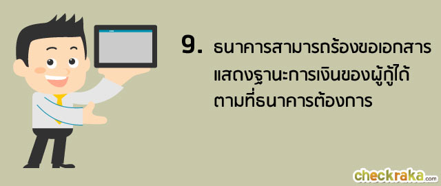 ผู้กู้ตกลงจัดส่งเอกสารที่แสดงความสามารถในการชำระหนี้ ฐานะการเงิน เช่น สำเนารายการเดินบัญชีสมุดเงินฝาก หนังสือรับรองเงินเดือนของผู้กู้ และบุคคลที่เกี่ยวข้องกับผู้กู้ตามกฎหมายว่าด้วยการธนาคารพาณิชย์ หรือกฎหมายอื่นใดที่ควบคุมการประกอบธุรกิจของสถาบันการเงินให้แก่ธนาคารอย่างน้อยปีละครั้ง หรือตามแต่ธนาคารจะร้องขอ