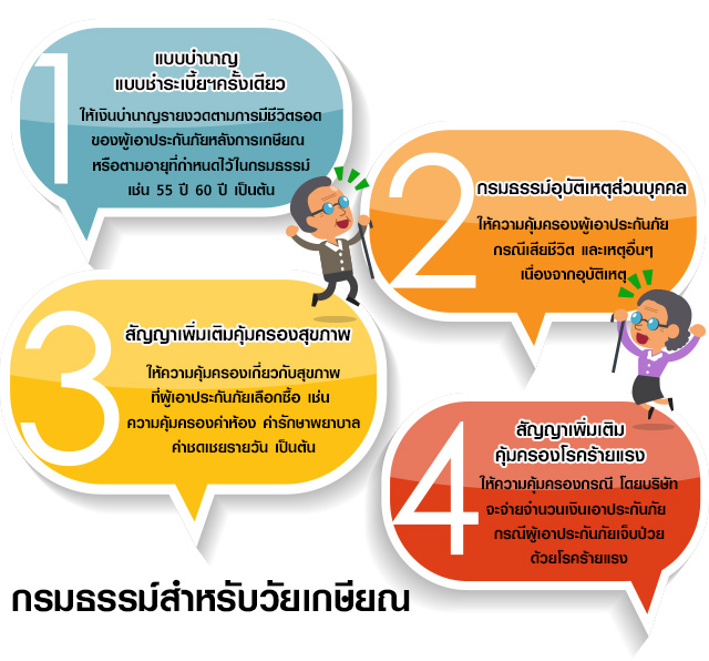 แต่อีกวิธีหนึ่งที่น่าสนใจสำหรับการวางแผนเกษียณอายุ คือ การเลือกซื้อกรมธรรม์ประกันชีวิตในแบบต่างๆ ซึ่งหากเราได้ทำประกันเหล่านี้ไว้บ้าง อย่างน้อยก็คงพอทำให้อุ่นใจว่าหากเราเกิดเจ็บไข้ได้ป่วย หรือเสียชีวิต เราจะไม่เป็นภาระหนักให้กับลูกหลานในอนาคตนะคะ
