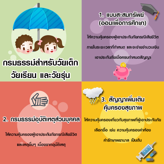 กับทั้ง 2 ช่วงวัยข้างต้น ผู้ปกครองสามารถมอบอนาคตที่ดีให้กับบุตรได้ด้วยการวางแผนการออมตั้งแต่วัยเด็ก เพื่อเป็นทุนการศึกษา เป็นค่ารักษาพยาบาลในยามเจ็บป่วยหรือเกิดอุบัติเหตุ ซึ่งจะช่วยแบ่งเบาภาระค่าใช้จ่ายตามแต่ละช่วงสถานการณ์ได้อีกด้วย เราลองมาดูกันนะคะว่าจะมีกรมธรรม์แบบไหนบ้างที่เหมาะสมสำหรับวัยเด็ก วัยเรียน และวัยรุ่น